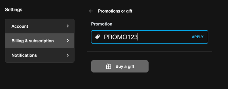 If you are a current subscriber, you can apply a promo code by going to your billing tab in your account settings and then clicking on “Promotions or gift.”